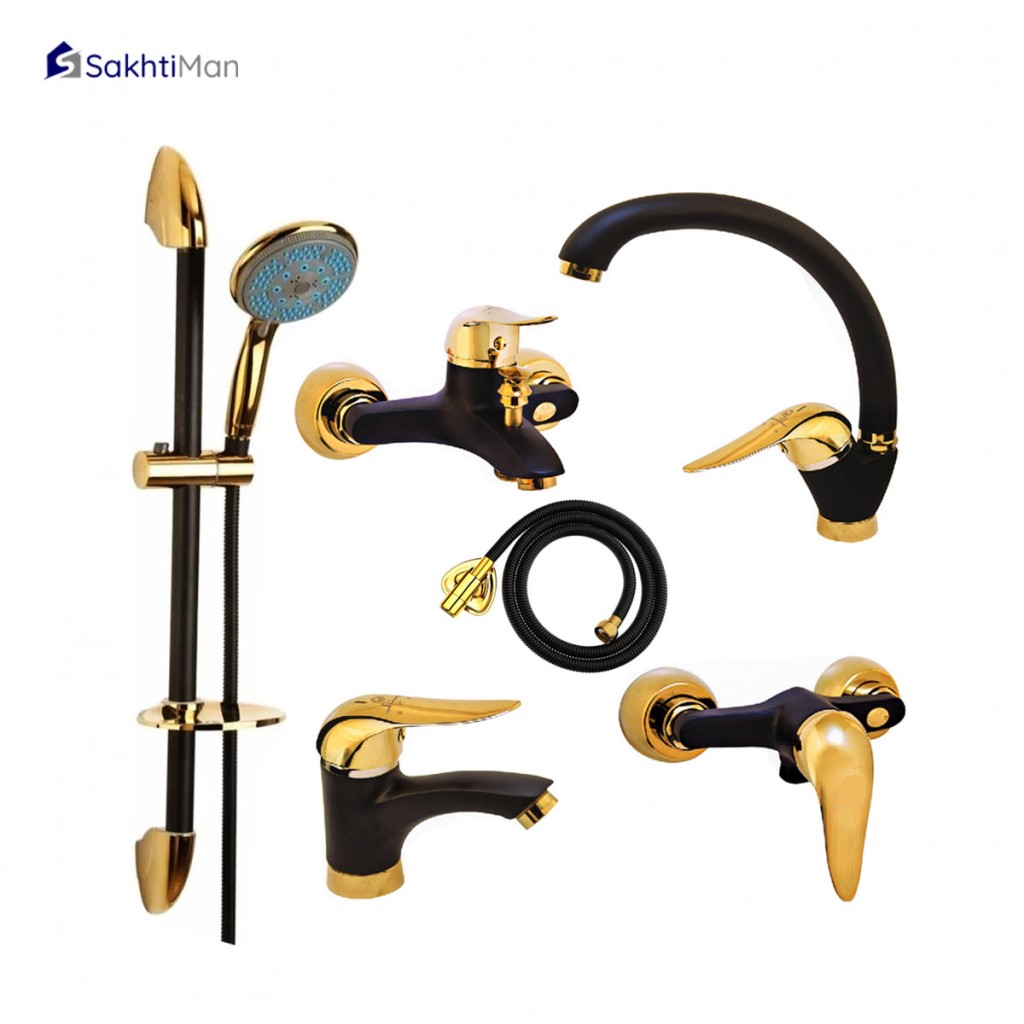 مجموعه 6 عددی شیرآلات بهداشتی مشکی طلایی مدل اردکی (شیر ظرفشویی، شیر روشویی، شیر دوش حمام، شیر توالت، علم دوش و شلنگ توالت) با کارتریج سایز 40 ارائه می شود.