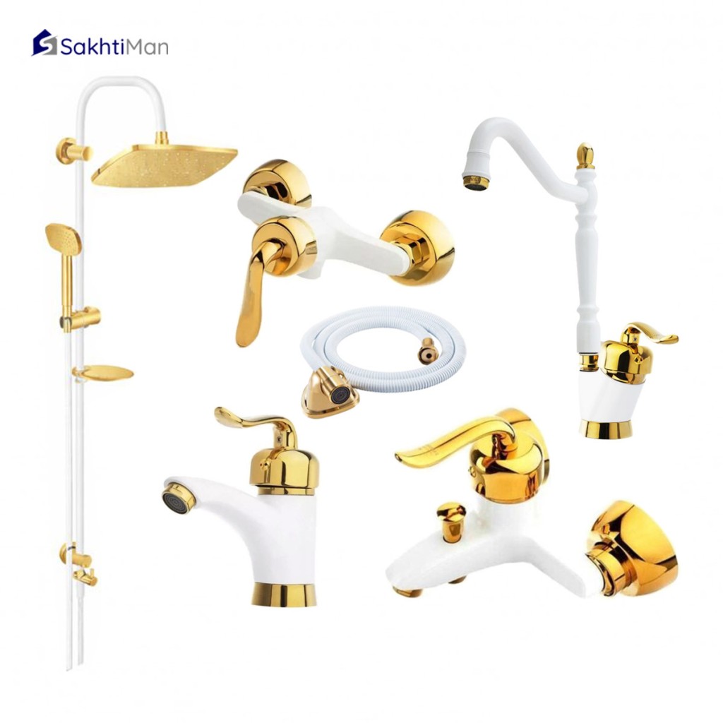 ست شش عددی شیرآلات سفید طلایی مدل قاجاری به همراه علم دوش دوکاره دارای قیمتی مناسب و کیفیت بالایی در ساخت می باشند.