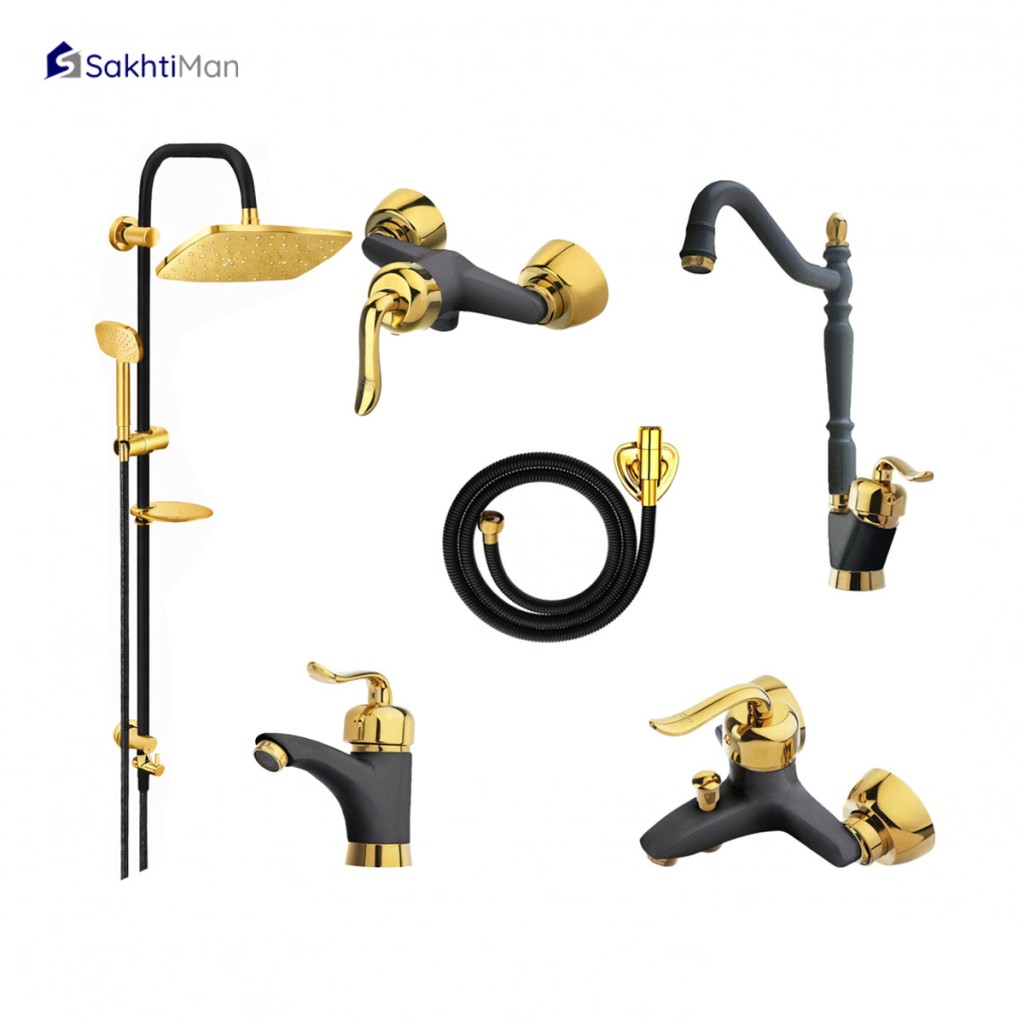 ست شش عددی شیرآلات مشکی طلایی مدل قاجاری به همراه علم دوش مشکی شامل ست کامل شیرآلات بهمراه علم دوش دو کاره مشکی و شلنگ توالت